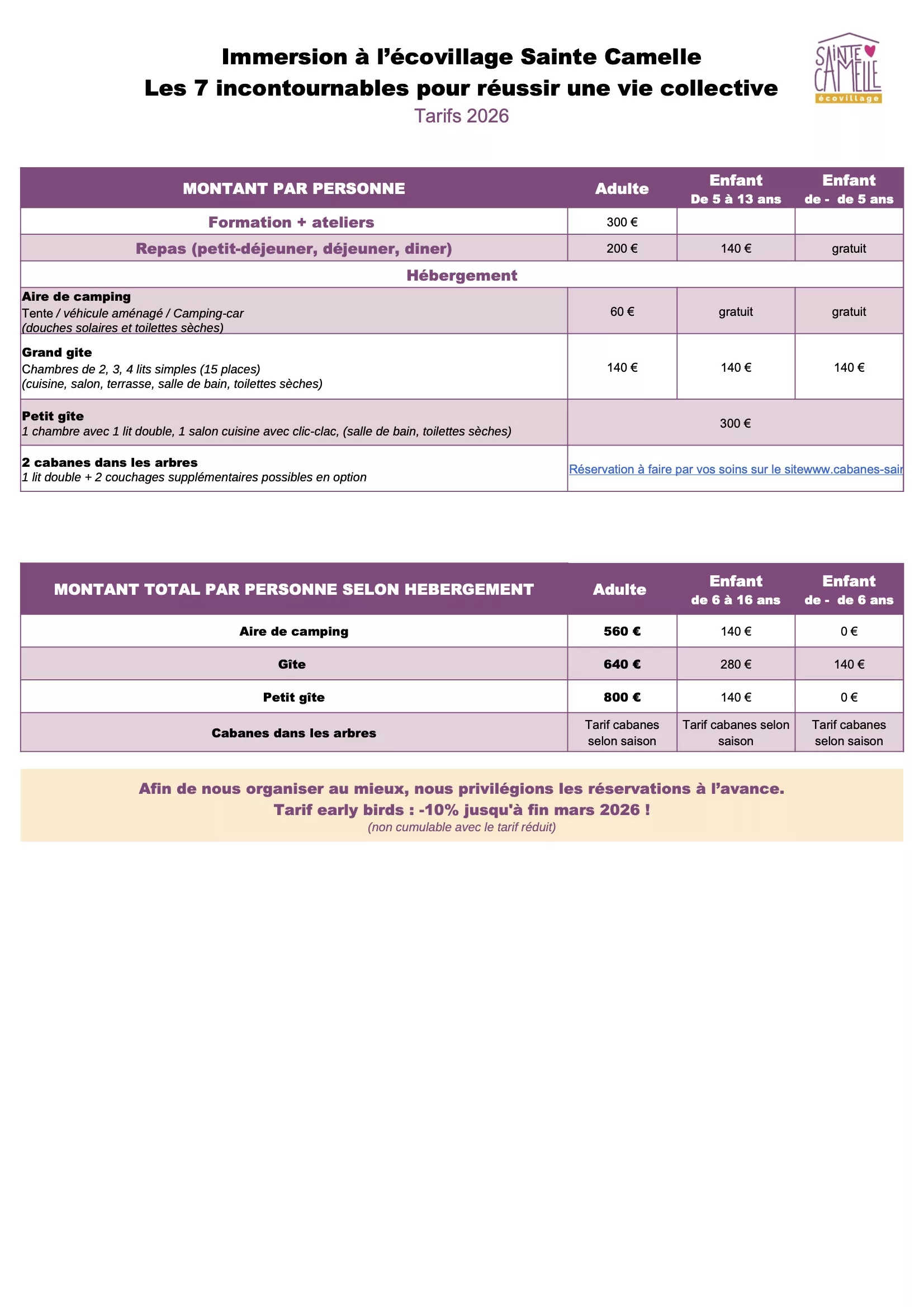 - Pour les hébergements (sauf cabanes dans les arbres), seuls les oreillers et couvertures sont fournis. Merci d’apporter vos draps, taies d’oreiller et/ou sac de couchage. Le matériel de camping n’est pas fourni.
