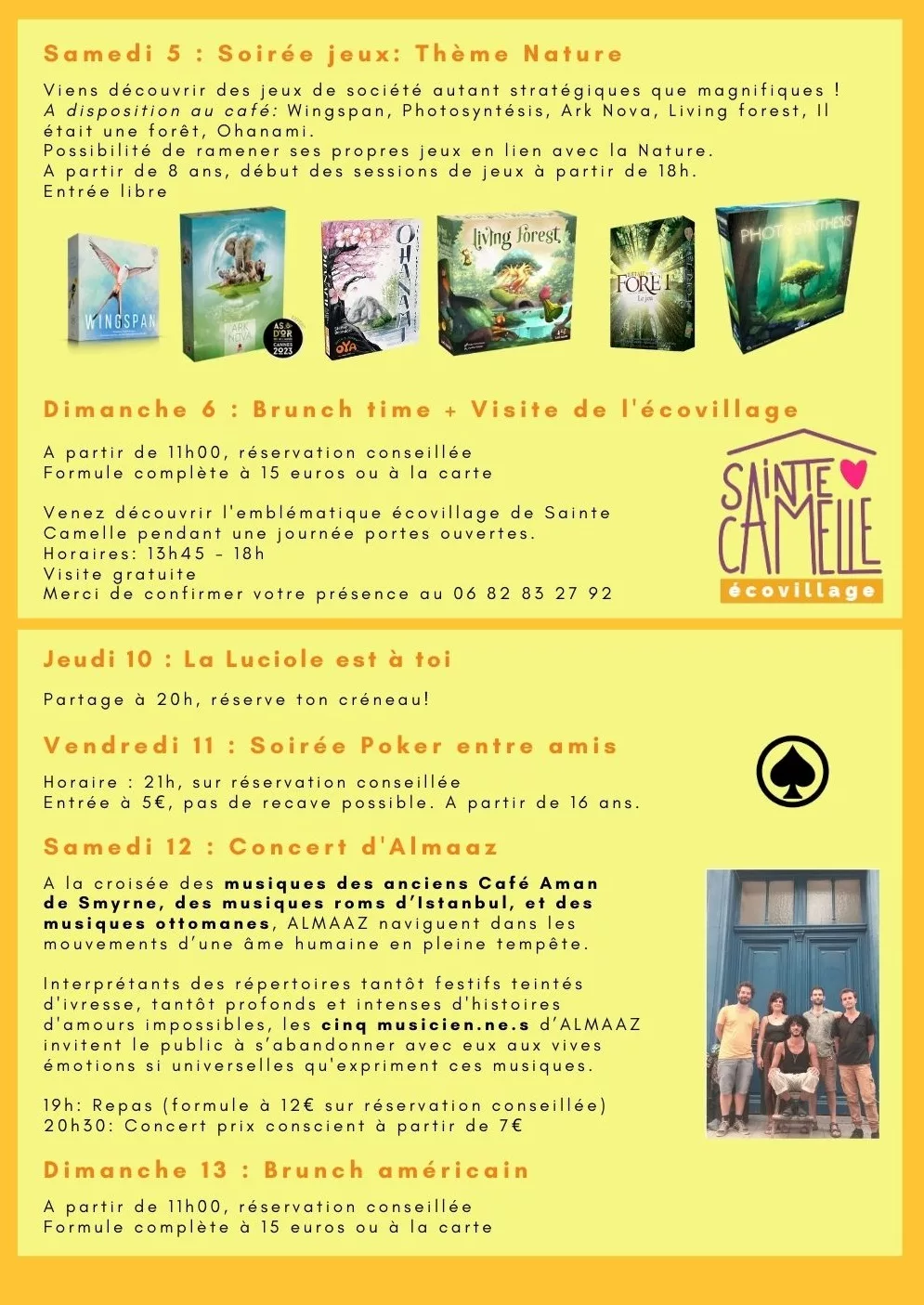 Le but de ces soirées – qui seront proposées tous les jeudis – est de mettre à l’honneur les adhérents et leurs talents!