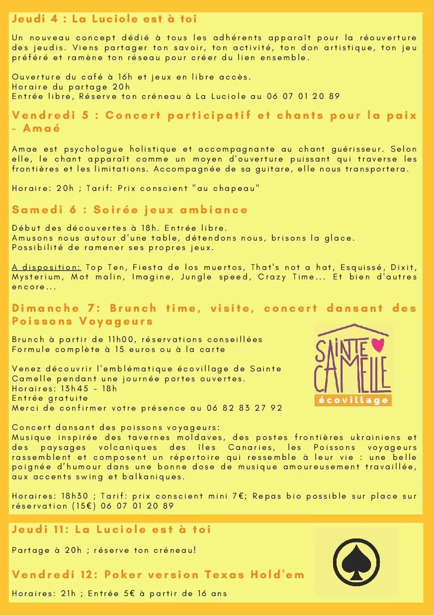 Bien sûr nous comptons aussi sur vous pour venir vous laisser porter par le flux de la vie et venir à l’improviste pour profiter d’un évènement qui vous sera inconnu car comme vous le savez tous : tout est juste et la vie nous présente ce que l’on a besoin de vivre !